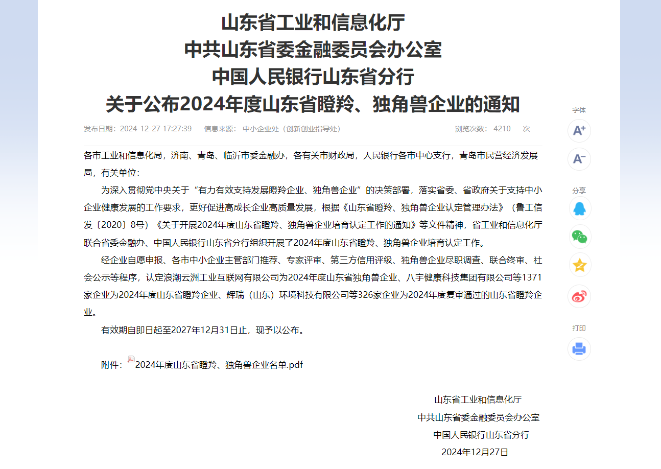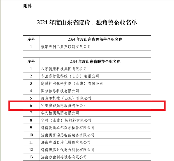 近日,山東省工業(yè)和信息化廳、中共山東省委金融委員會(huì)辦公室、中國(guó)人民銀行山東省分行公布2024年度山東省瞪羚、獨(dú)角獸企業(yè)名單。和普威視成功入選。